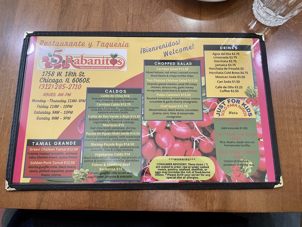 Welcome to 5 Rabanitos Restaurante and Taqueria, a vibrant ode to Mexican cuisine nestled in the heart of Chicago. Here, you'll find a menu brimming with authentic flavors and fresh ingredients, expertly crafted to satisfy both traditionalists and adventurous diners alike.